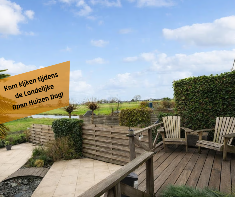 De diepe achtertuin biedt een prachtig weids uitzicht richting de molen en het groene landschap. Hier geniet je van lange zomeravonden, rust en privacy – een plek waar je elke dag thuiskomt met een gevoel van ruimte.